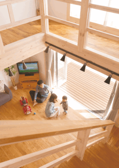 仕事を持ちながら、家事育児に追われる奥さまを幸せにしたいという一心で新築したご主人。生活の中心となるLDKは、開放感のある吹抜けを採用し、家族のコミュニケーションを取りやすくした。仕事から帰ってきた奥さまの家事時間を短縮するために、コンパクトな水回り動線と適量適所の収納を確保。伝統の真壁づくりと外張り断熱が標準仕様の『サイエンスホーム』の家は、エアコンに頼ることなく夏も冬も快適に過ごせて光熱費も軽減。ハンドクラフトのスケルトン階段やお気に入りのクロスでコーディネートされたシンプル&ナチュラルな空間は暮らしを豊かにしてくれる。「帰ってくるたびに木の香りと質感に癒されます。片づけの手間も減り、家族団らんの時間が増えました。主人に感謝です」と話す奥さまの笑顔が満足度の高さを物語っている。