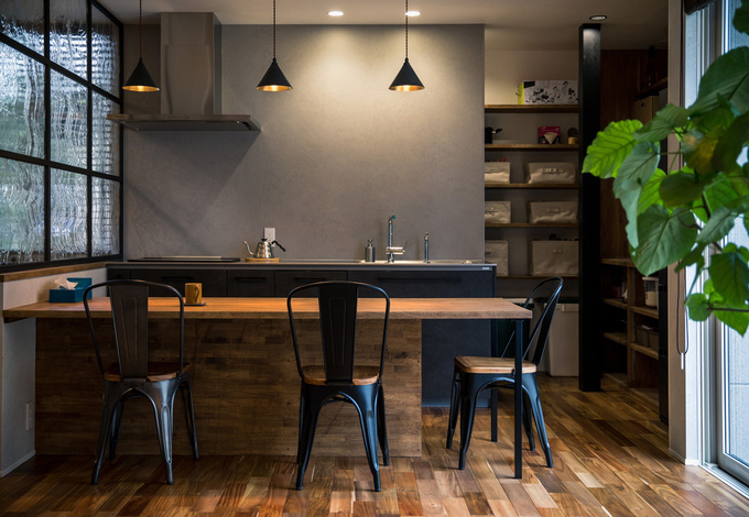 大小のグレーの箱を重ねたフォルムが個性的なM邸。室内はグレーの壁と無垢の床をベースに、インダストリアルと和を融合した空間をデザイン。玄関に入ると土間がLDKの奥まで続き、ダイニングと離れの和室を仕切っている。その結果、離れの和室にプライベート感が生まれ、旅館のようにゆったりとくつろげる空間が実現した。一方、ダイニングとリビングは、夫妻が提案したガラス張りの壁でゾーニング。それぞれの空間が緩やかにつながり、家族がどこにいてもお互いの気配を感じとれる。キッチンは壁付けのI型にして、造作のダイニングカウンターを配置し、省スペースと効率的な動線を実現。さらに、お気に入りの本をいつでも手に取って読書を楽しめるライブラリーや、雑多な小物を上手に隠したパントリーなど、便利な収納も適所に配置されている。これから家族が増えても、家事や子育てを楽しみながら、お気に入りの家で、お気に入りの暮らしを楽しめそうだ。