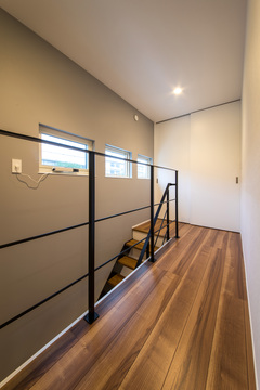お施主様の「みんなに自慢したくなるような家」というご要望を基に、外観は大小のグレーの箱を重ねて個性的に、室内はインダストリアル✖和が融合した独創空間をカタチにしました。