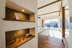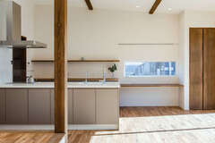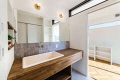 「階段の上り下りがない平屋の暮らしは、本当に快適」と、新しい家の住み心地を嬉しそうに話すSさん夫妻。日中は電気をつけなくても明るく、気持ち良い風が通り抜けるリビングが家族の憩いのスペースだ。塗り壁仕上げのリビングには、子どもがお昼寝をしたり、遊んだりするのにちょうどいい小上がりのヌックスペース。リビングは勾配天井にして外へと繋がる開放感を演出。床は木の温もりを感じられる無垢のオーク材、室内窓は造作のアイアン窓に。一つひとつ、細部まで気を配り、『Select工房』と作った家は、木の温かみに見守られ、穏やかに過ごせる場所となっている。心が落ち着く住まいの秘訣はデザインだけでなく間取りにも。例えば、忙しい朝でも家族が順番待ちをすることなく身支度できる広々とした造作の洗面や、家事動線抜群のランドリースペースなど、小さな“ラク”をつくる工夫を積み重ねている。