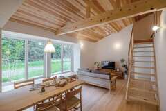 『住まいる』さんを知ったのは、同社で家を建てた友人が、「天然木の家を手頃な価格で建てられる」と紹介してくれたのがきっかけ。提案してもらったプランもとても気に入ったので決めました。薪ストーブや広い土間、吹き抜けの大空間など、自分たちが思い描いていたイメージをすべてカタチにしてもらえたので、とても満足しています。これからの暮らしが楽しみでたまりません!