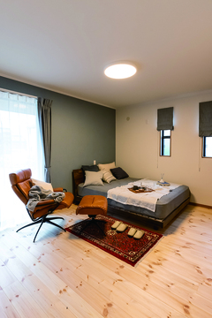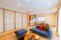 飽きが来なくて末長く愛着を持てる「正統派」の家を建てたいと希望したMさん。間取りで特にこだわったのは、家の顔である玄関。玄関ドアを開けた途端、大きな吹き抜けのホールが視界に広がり、圧倒的な開放感。天井まで真っ直ぐ伸びた杉の通し柱が存在感を放つ。室内はのびのびと暮らせるように、各居室や水回り、階段の幅など、全体的にスペースにゆとりを持たせてある。和のテイストが好きなご主人の要望で、リビングの横に小上がりの和室を設置。杉の丸太を加工した小上がりの框や、キッチンから見え隠れする格子の壁、家族を見守る桧の大黒柱など、天然木の魅力が室内のインテリア性を高めている。丸ごと快適な住まいで、これから家族がしあわせを紡いでいく。