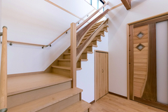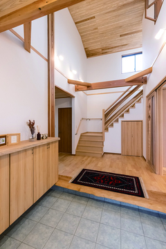吹き抜けや幅広階段を採用したダイナミックな玄関が特徴。リビングに小上がりを設けて框に丸太を用いるなど、ご主人からのプロ顔負けの提案や、奥さまの家事ラクアイデアも反映し、上質で居心地のいい家が完成しました。