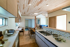 Iさんの新居は、最近人気の平屋+小屋裏の家。ワンフロアで生活でき、なおかつ家族4人が暮らすのにちょうどいい広さが備わっている。LDKの床には松(パイン)、天井には杉、壁には珪藻土を採用。勾配天井ののびやかさと自然素材の心地よさに包まれて、家族のコミュニケーションも豊かに育まれていく。天然木と珪藻土は調湿性に優れているため、夏はジメジメ感を防ぎ、冬は過乾燥を防いでくれる。また、小屋裏を設けたことで、収納スペースも十分に確保できた。さらに、水回りと寝室の間に配した広々ランドリーや、キッチン正面の家事カウンターなど、家事ラクな工夫も随所に凝らされている。平屋ならではの暮らしやすい家で、待望の新生活がスタートした。