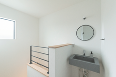 階段の近くに設置した造作の洗面スペース。ひとつひとつ「好き」を選んだこだわりが詰まった洗面です。フリースペース