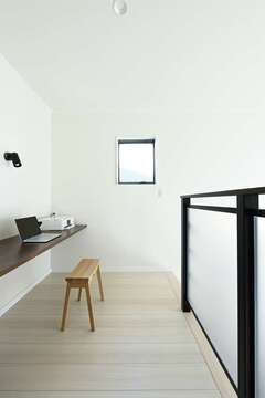 2階は、ホールにご主人のリモートワーク用のスペースを設けた。また、寝室は吹き抜けに面して内窓を設けてあり、窓を開けると1階にいる家族の様子もわかる。ウォークインクローゼットもスペースを広く取り、布団などのかさばった荷物もまとめて収納できるようにした。