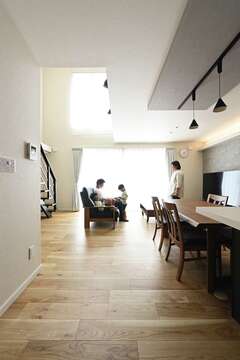 通勤に便利な駅近に新居を建てたSさん。「49.4坪の敷地をいかに有効に利用するかが家づくりのテーマ。採光も十分に確保したいと希望しました」とご主人。担当の山﨑さんと話し合いを重ね、希望の条件をしっかりクリアした新居が完成。21.3畳のLDKを中心とした無駄のない間取りが特徴的だ。キッチンは対面式にしてパントリーを用意し、南側に広いリビングダイニングを配置。リビングを吹き抜けにしたことで、高窓からたっぷり光が注ぎ、LDKを明るく照らす。また、5畳のランドリーを設けて洗面室と脱衣室を兼用したことで、省スペースと家事ラクを実現。LDKのスペースにもゆとりを持たせることができ、家族みんなでのびのび&ゆったりくつろげる暮らしが叶った。
