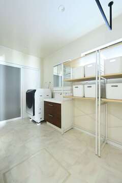 水回りを集約して一列に並べ、家事効率にすぐれた間取りが実現。LDKはL字型に配置し、リビングを吹き抜けにしたことで開放感が増した。開口部の配置を工夫し、どのスペースも明るく過ごしやすい空間が実現。
