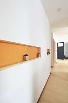 大隅さん、米田さん、長谷川さんという3人の女性スタッフが中心となって進められたS邸の新築計画。女性目線からの提案は奥さまの心をくすぐるものばかり。モデルハウスのデザインも参考にしながら、広い土間玄関やランドリールームなど、オリジナリティ豊かな平屋が完成した。新築してから、ご主人はマメに庭の手入れをしたり、奥さまは再びサーフィンを楽しむようになり、健康的に暮らしている。「あとは犬がやってくるのを待つだけです」と話す夫婦の笑顔が輝いていた。