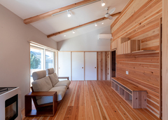 いつか家を壊すとき、自然に還る素材がいいと思い、最初から木の家と決めていました。ハウスメーカーか工務店か迷いながらモデルハウスや実例を見学し、家を建てた知人にも話を聞いたところ、オススメされたのが『有吉住宅』さんでした。実際に木を伐採している森の見学会にも参加し、地産地消の家づくりを実感しました。4月から暮らし始め、梅雨の時期も家の中は湿気が少なく、7月初旬まではクーラーなしで過ごせるほどでした。変型地を上手く活用して趣味のバイクガレージもつくっていただき、とても満足しています。
