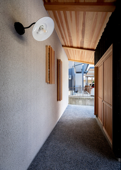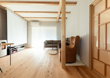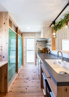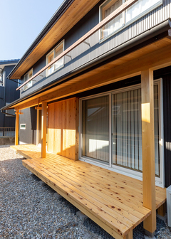 50代夫婦と20代の長男が暮らす一棟。今後長男が家を出て独立するかもしれないし、将来的に両親を呼び寄せて同居する可能性もあると、ライフスタイルがはっきりしないまま新築することになったHさん一家。そこで、『有吉住宅』は、どんなライフスタイルになっても柔軟に対応できるよう、可変性の高い間取りの住まいを提案した。外観は和とモダンが共鳴する京町屋風のスタイリッシュなデザイン。格子塀で玄関が見えない設計がプライバシーを守る。暮らしの中心となるLDKはシンプル&ナチュラルな18畳。いつでも両親が一緒に住めるよう8畳の洋間を隣接させた。駐車場から勝手口、キッチンへつながる家事ラク動線も確保し、共働き夫婦の負担を軽減。また、キッチン、洗面台、建具はすべて同社の大工が丁寧に造り上げた一点もので、手づくりの温かみが空間に横たわる。家族が自然に集まってリビングでホームシアターを鑑賞したり、ウッドデッキでお酒を飲んだり、この家に住みはじめてから家族の絆がより深まったのだそう。