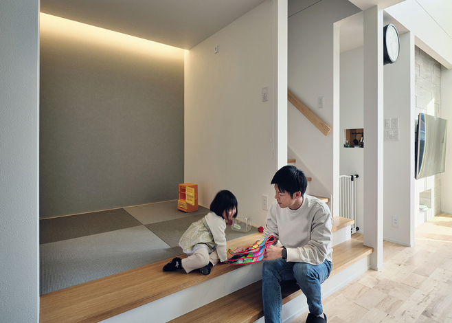 建築家と楽しくプランニングを進め、上質なホテルのように居心地が良く、洗練された二階建てを叶えたYさん。夫妻がこだわったのは、キッチンと収納と周囲の視線対策。まず、キッチンはペニンシュラ型で調理場所を広く取り、家事ラクとデザイン性を兼ね備えた空間が実現。次に、収納はコーディネーターとじっくり打合せを行い、玄関や脱衣スペース、キッチンのパントリーなど、使い勝手にピッタリなサイズを確保した。さらに、周囲の視線対策として、リビングから続くモルタルデッキの道路側に目隠し壁を設置。家の中にいても、庭で遊んでいても、周囲を気にせずくつろぐことができる。約20畳のLDKは、家族3人で過ごすには十分な広さ。吹き抜けによって、いっそう開放感も得られた。また、主寝室から吹き抜けが見渡せる内窓を設けて、開放感と家族のつながりを確保するなど、独創的なアイデアも形に。ホテルライクな空間に遊び心を散りばめた家が、家族にときめきをもたらし続けている。