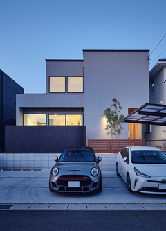 約50坪の敷地に建てた延床32坪の二階建てのY邸。ポピュラーなサイズ感が、これから家を建てる方にも大いに参考になる事例です。住宅街に立つなので、周囲の視線を気にせず、気兼ねなく過ごせるように、リビングの正面に目隠し壁を設けました。
