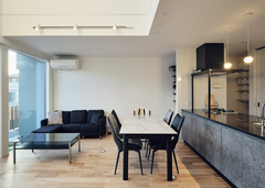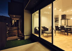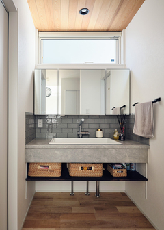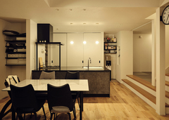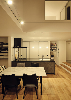 建築家と楽しくプランニングを進め、上質なホテルのように居心地が良く、洗練された二階建てを叶えたYさん。夫妻がこだわったのは、キッチンと収納と周囲の視線対策。まず、キッチンはペニンシュラ型で調理場所を広く取り、家事ラクとデザイン性を兼ね備えた空間が実現。次に、収納はコーディネーターとじっくり打合せを行い、玄関や脱衣スペース、キッチンのパントリーなど、使い勝手にピッタリなサイズを確保した。さらに、周囲の視線対策として、リビングから続くモルタルデッキの道路側に目隠し壁を設置。家の中にいても、庭で遊んでいても、周囲を気にせずくつろぐことができる。約20畳のLDKは、家族3人で過ごすには十分な広さ。吹き抜けによって、いっそう開放感も得られた。また、主寝室から吹き抜けが見渡せる内窓を設けて、開放感と家族のつながりを確保するなど、独創的なアイデアも形に。ホテルライクな空間に遊び心を散りばめた家が、家族にときめきをもたらし続けている。