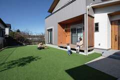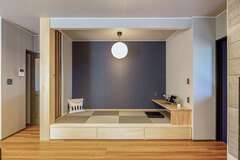 キッチンを中心に、部屋の隅々まで目が行き届く間取りです。小上がり畳スペースも、木の格子で視線が抜けるように設計しています。大きな間口を2か所に設け、ブラインドの先の庭へ目が届くところもポイントです。