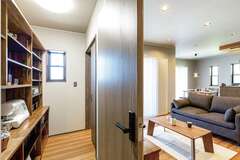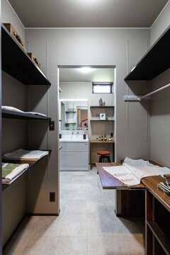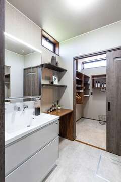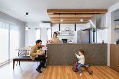インテリア好きのTさん夫妻は、洒落たカフェや雑貨店へ遠征し、写真を撮るのが共通の趣味。そんな二人が4年を掛けてパートナーに選んだのが、『深見工務店』だ。理想の間取りが完成するまで何度も打合せを重ねた。「私たちのペースに合わせ、無理のないよう気遣ってくれたのがうれしかった。深見さん自身の子育て経験からの提案や家づくりの想いに共感できた」と当時妊娠中だった奥さま。幼少期から家に収納術の雑誌があり、プロの収納に憧れていたというご主人は、住まい方アドバイザーの資格を持つ女性建築士と共に実現したリビングクロークがお気に入り。「社長の親しみやすく、経験豊富なアドバイスが頼もしかった」と話し、これからの暮らしに思いを馳せている。
