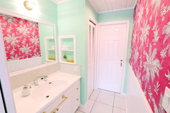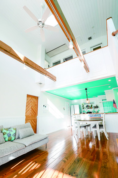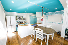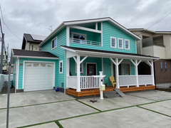 サーフィンが趣味で、家を建て替えるならサーファーズハウスと決めていたAさん。『ジェネラルアメリカンホーム』のOB宅を見た瞬間、家族みんなが歓声を上げたそう。「外観だけでなく、内装も海外の住宅そのもので、お洒落かつ個性的なデザインに圧倒されました」と振り返る。オープンハウスでさまざまな実例を見学するうち、夢のイメージが大きく膨らみ、外観だけでなく内装にもティファニーブルーを多用することに。「ジェネラルアメリカンホームさんのとの家づくりは、とにかく自由。基本的な構造以外は、施工を進めながら現場判断でギリギリまで変更に対応してくれました。悩む時間も楽しかったです」とAさん夫妻。ゆったりとしたカバードポーチ、リビング階段、対面キッチン、ウォークインクローゼットなど、取り入れたかったものはすべて叶い、大満足の仕上がりだと口をそろえる。