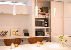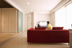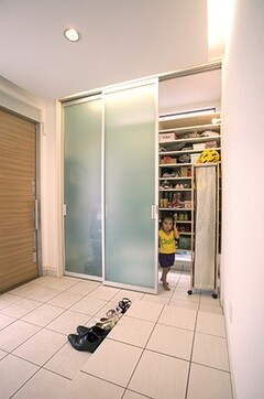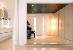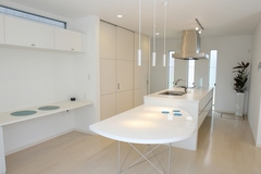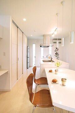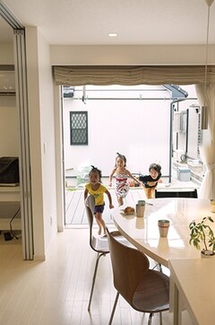 白が基調のスタイリッシュな空間に原色のインテリアをあしらったポップなコーディネートが映えるAさんの住まい。ご夫妻は共働きのため、帰宅後の時間のほとんどを家事や子育てにあてるのが日常。そのため、家事や子育てを効率よくこなせる暮らしを理想としていた。「彦坂建設さんはキッチンが中心となった間取りを提案してくれ、自分たちの求めるものを形にしてくれました」と奥さま。おかげで時間に余裕が生まれ、家族でくつろぐ時間を確保できた。キッチンからはリビングや庭先で遊ぶ子ども達の様子を見守ることができ、回遊式の動線で調理も片付けも楽々。しかも、スペースにゆとりがあるので、家族でクッキングを楽しむこともできる。さらに何年たってもスッキリとした清潔感のある部屋にするため、各所に「隠し収納」も設けた。清々しい白の空間の中で、子ども達の愛くるしい笑顔がキラキラとはじけていた。