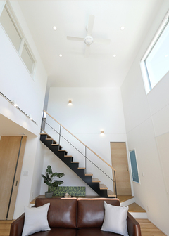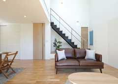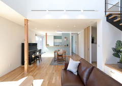 『丸昇彦坂建設』の分譲地に理想の新居を構えたTさん。庭に設けたウッドデッキとパーゴラが夫妻のこだわり。家の中にいても自然の光や風を心地よく感じられるように、LDKには吹き抜けと大開口。床にはナラの無垢材を採用し、「自然」を常に身近に感じ取れる暮らしが実現した。室内には、子どもが大きくなっても家族のコミュニケーションを取りやすいように、リビング階段を採用。吹き抜けで1階と2階がつながり、どこにいても家族の気配を感じ取れる。また、アイランドキッチンを中心に回遊できる動線を確保し、水回りをキッチンの隣に集約して、家事効率がアップ。シューズクロークや2階の納戸、主寝室のウォークインクローゼットと、たっぷりの収納で部屋をいつもきれいに保つことができる。自慢のパーゴラでは、ブランコを吊るしたり、お家アウトドアに挑戦したりと、これからの楽しい予定がいっぱいだ。