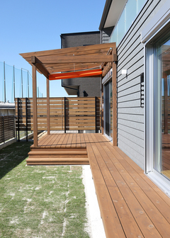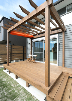 とても仲の良いご家族で、お子さまも一緒になって好みの内装を選んでいるようすがほほえましく、家族全員の意見を反映した楽しい家づくりができました。室内だけではなく家族のコミュニケーションの場として庭にパーゴラを設けたのもご夫妻のこだわりです。