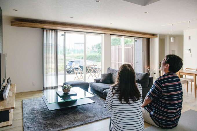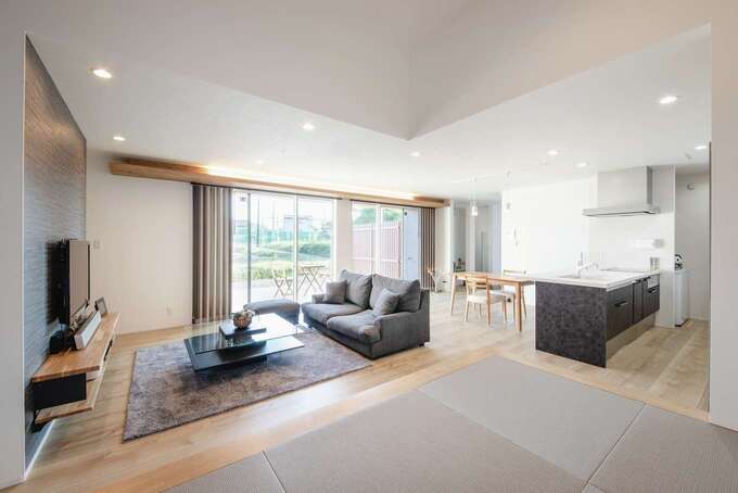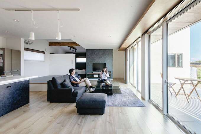 梁を木と鉄の「テクノビーム」で強化した安心・安全な耐震工法「テクノストラクチャー」だから実現できる大空間・大開口リビング。外と内のつながりを感じながらリゾートのように暮らせる