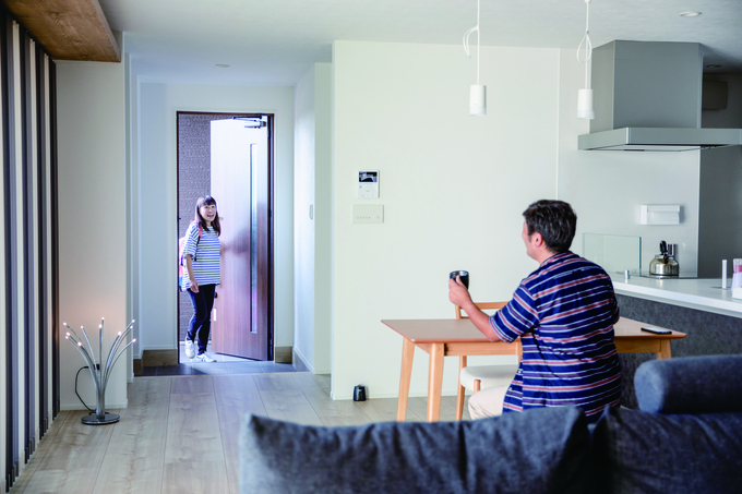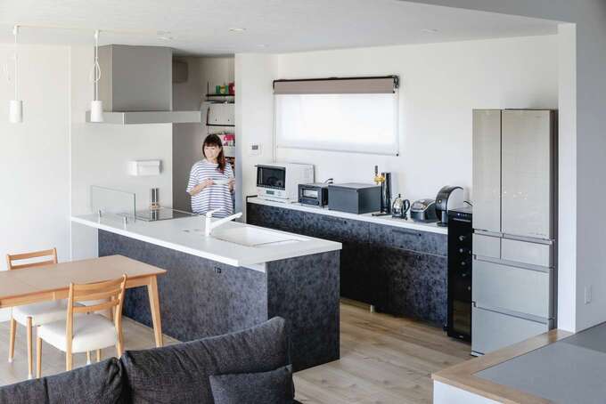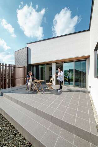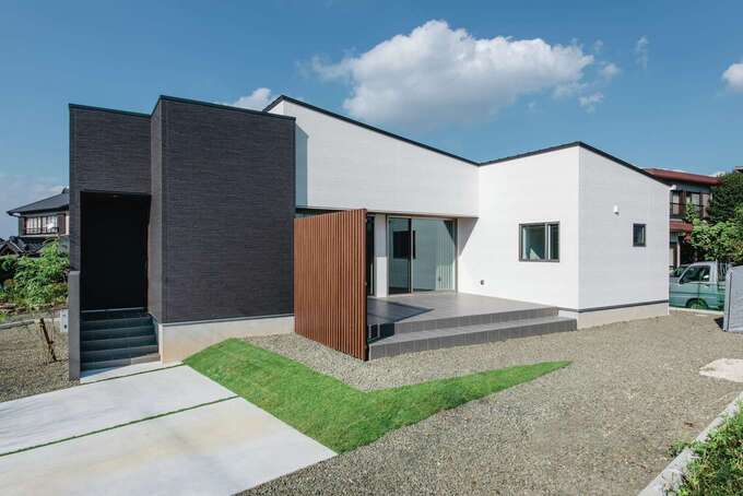 広い土地を活かして平屋を建てたKさん。夫婦二人だけなので部屋数は多く要らないと、間仕切りのないフルオープンな空間に。「営業の飯田さんのご自宅がそうなっていたので、イメージしやすかったです」と奥さま。『吉川住建』が得意とする「テクノストラクチャー工法」による部材の強さを活かし、多くの柱を必要としない大空間・大開口を実現。リビングの窓を開けると14畳のタイルデッキとつながり、グランピングやBBQなど、アウトドアリビングとして楽しめる。キッチン、トイレ、洗面台、浴室、照明はオールパナソニック製でコストダウンにもつながった。強靭な耐震構造、高い断熱・気密性能にモダンなデザインをプラスした住まいは、毎日をリゾート感覚で過ごすことができる。