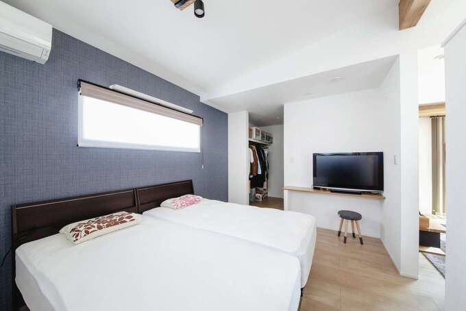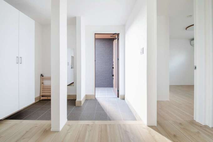出入口のドアもない。勾配天井と白い壁でより広く感じられる。大容量のウォークインクローゼットを完備