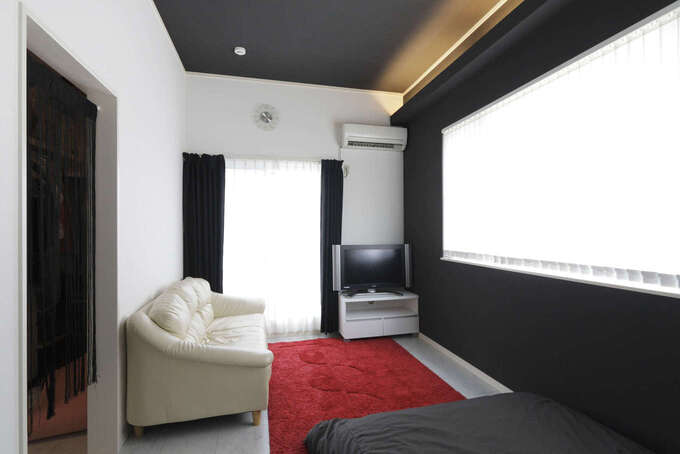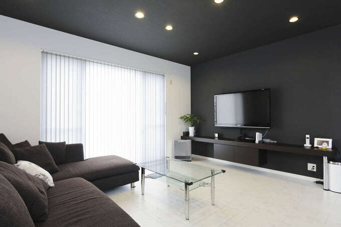 「バーのようなデザインに」と、リビングの天井や壁は黒を基調としたシックな雰囲気に。壁一面のテレビボードは造り付けで、おしゃれなデザインに仕上がっている。黒い天井に埋め込まれたダウンライトも、よりア