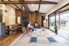 なんといってもキッチンを中心とした間取りです。今どきの家と比べたらリビングスペースは小さめですが、天井の構造材を化粧で見せることにより、より広々としたLDKをはじめ、小上がりになった7.5畳の和室、窓の外に広がるウッドデッキのおかげで、狭さを感じることはありません。食事をしたり、くつろいだり、キッチンの回りに家族が自然と集まる暮らしにとても満足しています。
