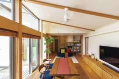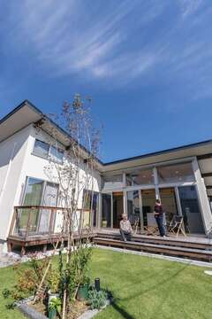 額縁職人として活躍するご主人の「さまざまな人と交流をしながら、ゆったり暮らしたい」という思いを受けとめ設計。大屋根を持つ居心地のよい家が完成しました。