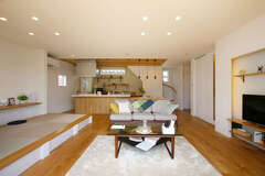 窮屈な社宅生活から脱出して、広いリビングと庭のある家で子どもをのびのび育てたいと望んでいたAさん。そのために最低でも20畳以上のリビングと、天井まで届く大きな窓が欲しいと『片桐建設』にリクエストした。完成した住まいは、唯一無二の独創的な外観デザインで、思わず二度見してしまう。リビングに入ると、6m×6mの大空間に間口4.5mの大きな窓が設置され、言葉では言い尽くせないほどの開放感がある。2階はフリースペースにスキップフロアを採用し、ご主人がリモートワークできる書斎と家族共有のロフトも作った。これだけの広い木造住宅でも、同社ならではの高い断熱・気密性能により部屋間の温度差が少なく、夏も冬も快適に過ごせる。「住み始めてから1年半が経ちましたが、全く不満がないですね」と話すご主人。こんなに快適な暮らしができる家を多くの人に知ってほしいと、予約制でオープンハウスとして公開してくれている。興味のある方は気軽に『片桐建設』に問合せてみて。