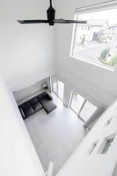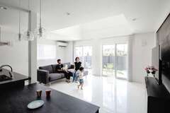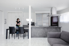 大理石調の床や吹き抜けのあるLDKがスタイリッシュなK邸。理想を形にするため、SNSで見つけて気に入った内装や設備の写真を『絆家』の担当者に見せたという。仕上がりはイメージ通りで、「『絆家』さんで取り扱いがない商品でも柔軟に採用してくれた」とKさん。扉付き収納など生活感を減らす工夫も豊富。「Air断」で快適な空気に包まれ、家族でのんびり過ごす時間を楽しんでいる。