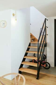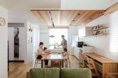 45坪の敷地を有効利用したSさんの新居。敷地内に駐車場はもちろん、ウッドデッキ付きの庭まで確保したうえで、延床約30坪の二階建てが実現した。夫妻は共働きのため、LDKの中央にアイランドキッチンを設け、キッチンを中心に生活できる間取りをプラン。キッチンの横にテーブルを一列に並べ、背面にはスタディコーナーを設けてあるため、回遊動線がフル活躍する。また、「収納は十分に設けたい」という奥さまの要望で、1階にアウトドア用品や生活用品などをまとめてしまえる約3畳の納戸も確保。片付けや調理などの家事を手際よくこなしながらコミュニケーションも深められ、キッチンはいつも家族の笑顔に包まれている。