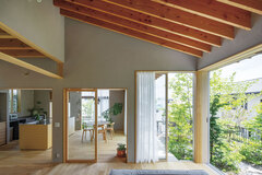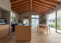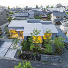 雑木の緑を主役とした自然豊かな中庭のある平屋の住まい。用途を限定しない多目的な“余白スペース”を大切にしたおおらかな空間としています。主寝室へは屋外空間である中庭からアプローチするという独特な動線で夜空を見上げたり、外空間で呼吸することで気持ちの変化を促します。建物のデザイン、色使い、素材選定はよりシンプルに、人間は本能的に自然を求めるというコンセプトに心の豊かさを大切にしています。
