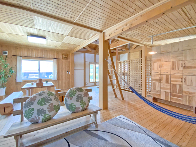 すべて国産無垢材でつくる家の心地よさを、天然木に包まれたショールームで体感できる。職人手づくりの建具をはじめ、無垢材のダイニングテーブルや丸太のイス、和紙の断熱障子パネルなどもあり、実際の住まいをイメージできるつくりだ。同社が提案する「税込1000万円の家」は、広さ約17坪の2LDK平屋で屋根のデザインは片流れ。建具や窓の数が同じなら、間取りの変更などもOKで自由度が高い。
