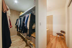 ファミリークローゼットの横には洗面スペースを設置しているので、朝の身支度もスムーズ。クローゼットの棚とパイプは稼働式で、追加や変更がしやすいトイレ