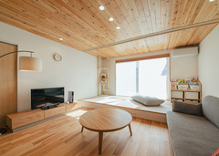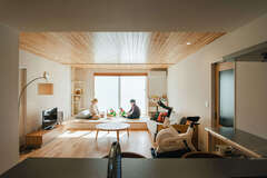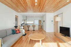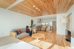 木の心地良さを堪能できる18.5畳のLDK。窓辺に畳コーナーもあり、自然とみんなが集まるLDK