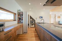 効率的に料理ができるよう、キッチンは横並びの3口コンロに。階段下のデットスペースは収納として活用しているランドリールーム