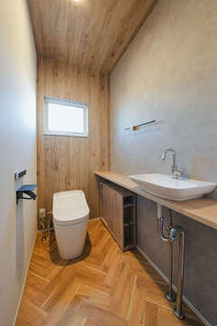 ヘリンボーンの床がオシャレなトイレ。LDKに合わせて木のテイストを取り入れた畳スペース