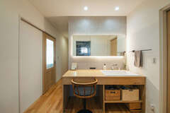 洗面化粧台も木を基調に造作してホテルライクなデザインに仕上げるなど、細部までこだわったウォークインクローゼット