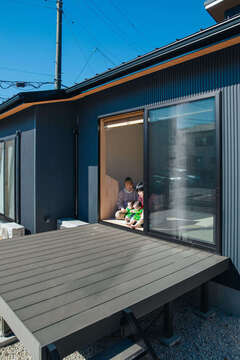 ガルバリウムのシンプルな外観。2階は子ども室と小屋裏収納だけで、平屋感覚で暮らせる築58年の祖母の家を建て替え、同居を始めたSさん。木の雰囲気が好きな奥さまの希望を反映し、玄関ホールからLDK、廊下、2階もすべてカエデのフローリングを採用した。リビングの天井には杉板を取り入れて和モダンな雰囲気に仕上げたり、窓辺に小上がりの畳コーナーを設け、ウッドデッキとつなげたのもこだわりの一つ。子どもたちと愛猫は畳の上で日向ぼっこをしたり、育児真っ最中で家にいる時間が長い奥さまも、大開口から注ぐ自然光と木のぬくもりに包まれて一息つける空間だ。キッチン、脱衣室兼ランドリー、ウォークインクローゼットが回遊動線でつながるのも家事ラク動線も便利。「2階は子ども室と小屋裏収納だけなので、平屋感覚で暮らせます」と話すSさん。散歩が好きな祖母の部屋は玄関近くに配置し、Sさん夫妻の寝室や書斎はリビングを挟んで奥にする間取りに。プライベートな空間は離れているため、気兼ねなく生活できるのも魅力だ。