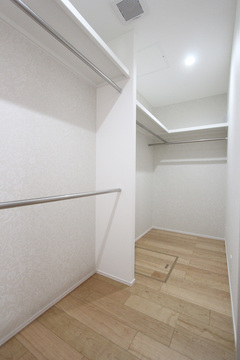 キッチン奥の扉からつながるファミリークローゼット。洗濯後の衣類は、動線よくまとめてここに収納できるようにしたキッチン