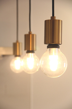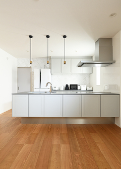 キッチンの手元灯は、タングステンフィラメントの白熱電球をイメージしたペンダントライト。ゴールドのソケットが美しくきらめいているキッチン