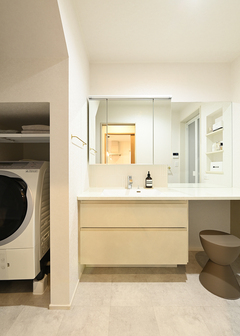階段下を有効活用してランドリースペースに。座ってメイクができるよう、洗面台を広くしたのも奥さまのこだわりトイレ