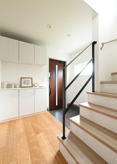 自然光がたっぷり差し込む玄関。夜は人感センサーで照明が点き、消し忘れの心配もないため、とても快適洗面スペース