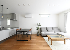 塗り壁の見た目が好きな奥さまと、スタイリッシュな家にしたいというご主人の希望をミックスし、外壁はグレーのジョリパッド仕上げにLDK