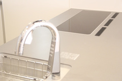 ゆったり使える横並びの3つ口コンロと、センサー水栓で毎日の家事がスムーズに地震に強い構造など、長く安心して暮らせることを意識して、好きなテイストを詰め込み、長期優良住宅を完成させたKさん。外観はダークグレーの塗り壁でスタイリッシュに。室内は淡いトーンを基調にして、表面が無垢材の突板フローリングを組み合わせ、やさしい雰囲気に仕上げた。「動画サイトのルームツアーなどを参考に、快適な動線も考えました」と奥さま。キッチンの背面にファミリークローゼットを設けたことで、洗濯後の衣類をそれぞれの個室へ運ぶ手間を省くことができたのもこだわりのひとつ。ハンガーのまま収納できるだけでなく、ランドリースペースを兼ねた洗面脱衣室との行き来もスムーズ。日々の家事にストレスを感じないという。「最新のシステムキッチンなど、設備についても多少の予算オーバーなら妥協せず、いいと思ったものを取り入れました」と話すKさん夫妻の笑顔が、満足度の高さを物語っている。