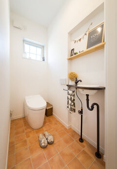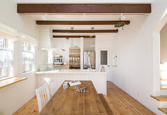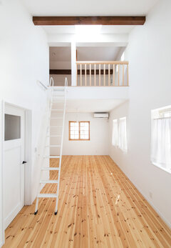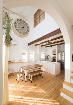 プロヴァンス風が理想のイメージだったK邸の奥様。真っ白な壁に、床や化粧の梁、アイアンや洗面のタイルなどのアクセントがかわいらしさを醸し出す。ダイニングや2階のロフトの大きな吹き抜けは、冬場、寒くなるイメージだが、SW工法、高気密、高断熱が大空間であっても快適な生活を担保する。