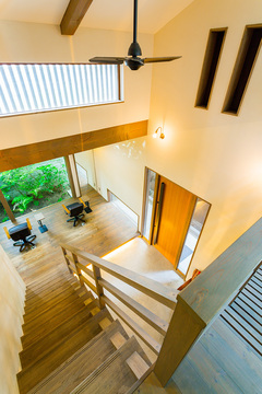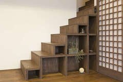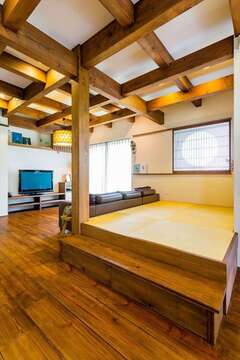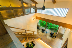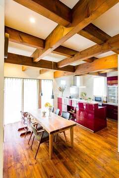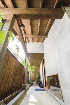 「大人の隠れ宿」というテーマの通り、そのまま通り過ぎてしまうほど気配を隠した外観が特徴のT邸。南北に長い敷地を最大限に活かし、1階は奥さまが経営する美容院と住居、2階はご主人の仕事場と子ども部屋などが置かれている。感性豊かな夫妻が求めたのは、流行に左右されず、以前からずっとそこに建っていたかのように見える佇まいで、住むほどに風合いを増していく家。仕事柄、人が集まる機会も多いため、LDKは約30畳の大空間を確保し、落ち着いた色合いの家具でコーディネートした。ワイルドな無垢の床や天井の太い梁組に癒やされると同時に、時間がゆっくりと流れる空間は日常の喧騒を忘れさせてくれる。天候を気にせず昼寝や読書を楽しめる軒の深いウッドデッキ、景色までデザインした大きな窓など、外と内を緩やかにつなげるプランニングで、光と影、風の匂い、雨の音など、季節の移ろいを身近に感じることができる。新築から8年。手をかけながら大切に住んでいる家は、ますます味わいを深めている。