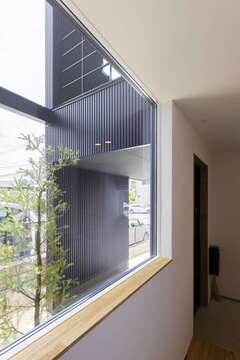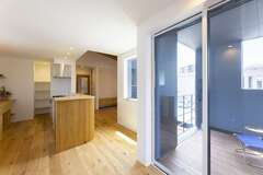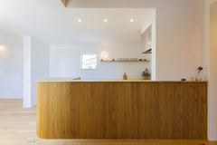 三方を家に囲まれた住宅街の旗竿地でも、外からの視線が気にならず、のびのびと暮らせるK邸。1階を寝室と子どもたちの個室、2階にLDKを配置し、明るく抜け感のある住まいに。リビングダイニングとつながるデッキバルコニーもあり、自然の光と風を感じながら、ゆったりと過ごせる。建物の一部を凹ませてシンボルツリーを植え、玄関、リビング、デッキなど、さまざまな場所から眺められるようにしたのもK邸の特長のひとつ。オークの無垢床をはじめ、素材もじっくり吟味したというKさん。玄関収納や洗面台、キッチンのカウンターは造作で、角材を八角形に削った階段の手すりは、受け金具からオーダーしたもの。LDKの入り口にあるガラスの引戸には、子どもでもつかみやすい形状の真鍮ハンドルを別注で取り付けるなど、ひとつ一つにKさんのこだわりとセンスが詰まっている。